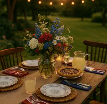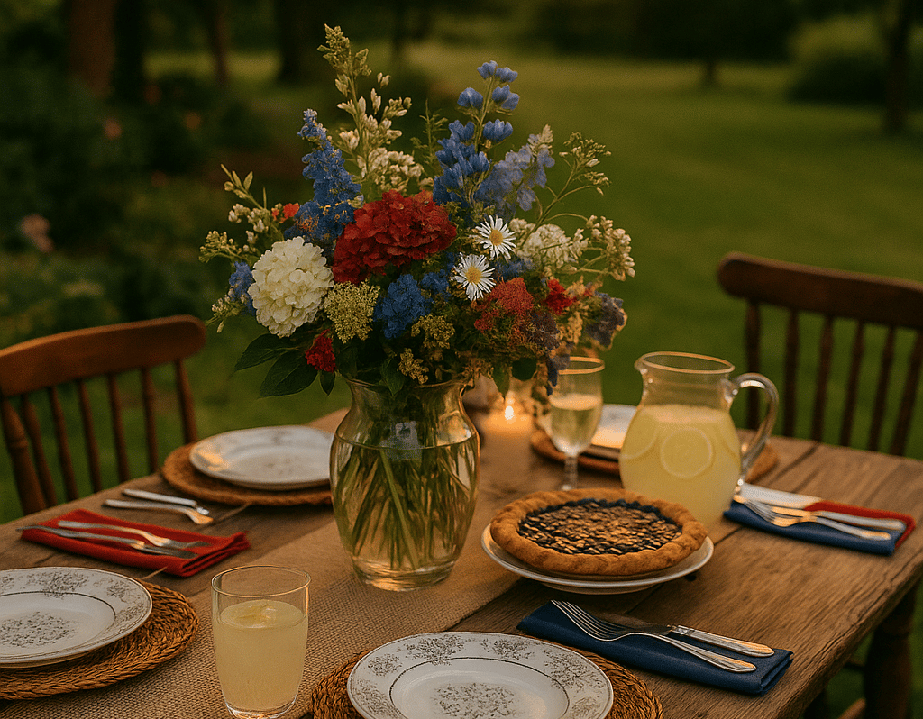 Dark wood, lush florals, gold flatware, and candlelight create a high-end, elegant take on patriotic entertaining. It’s timeless, rich, and ideal for twilight gatherings.