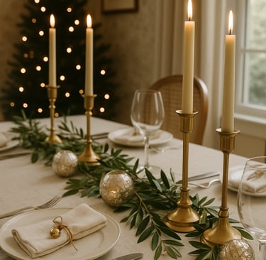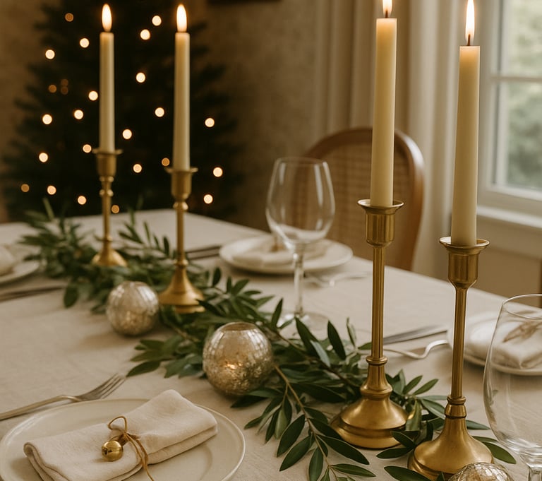 Holiday sparkle — sprinkle in mercury glass bowls, a few vintage ornaments, or tie little gold bells to napkins or wine stems—tiny details guests will remember.